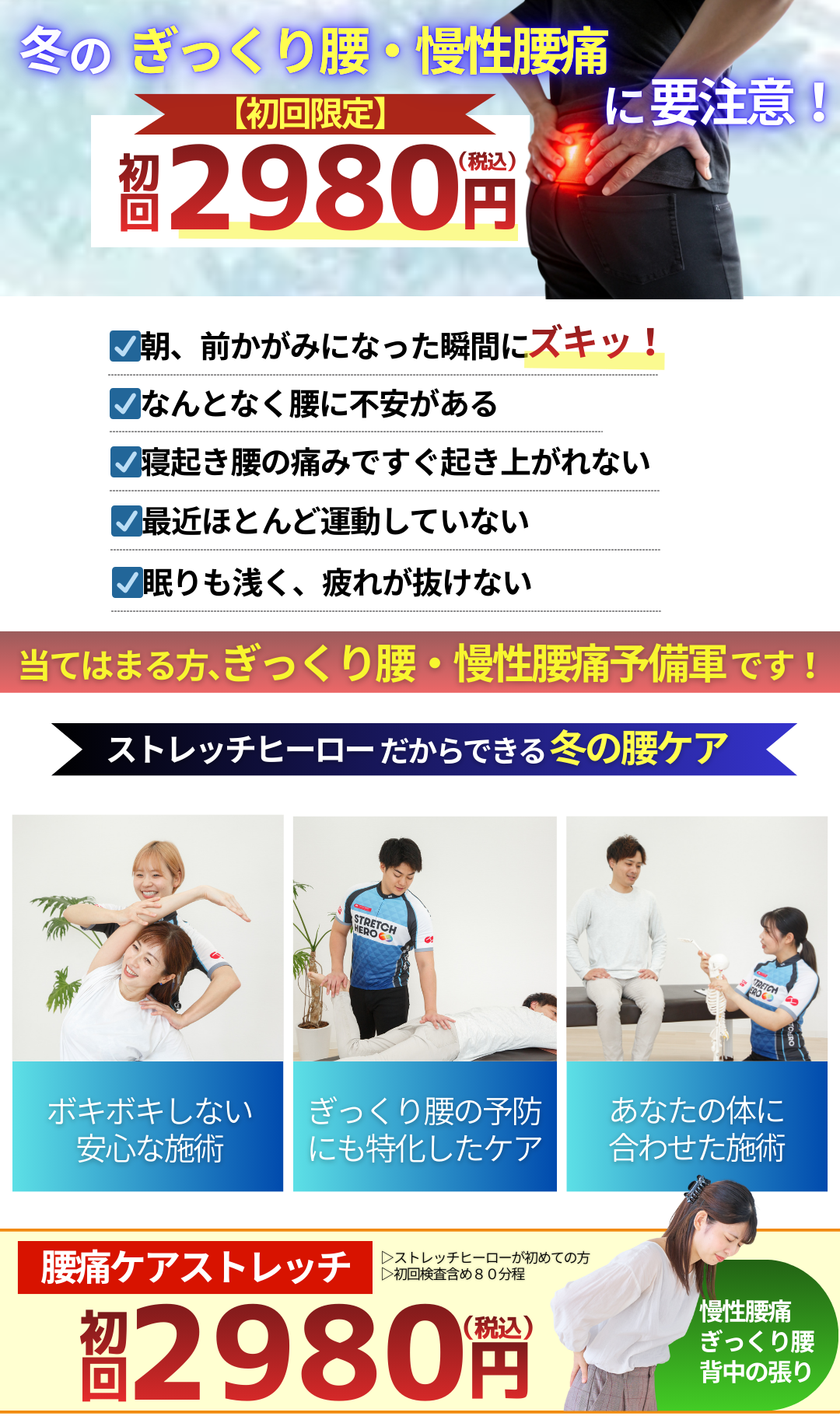 腰痛ケアストレッチキャンペーン《初回2980円》 を見て』とメッセージください。